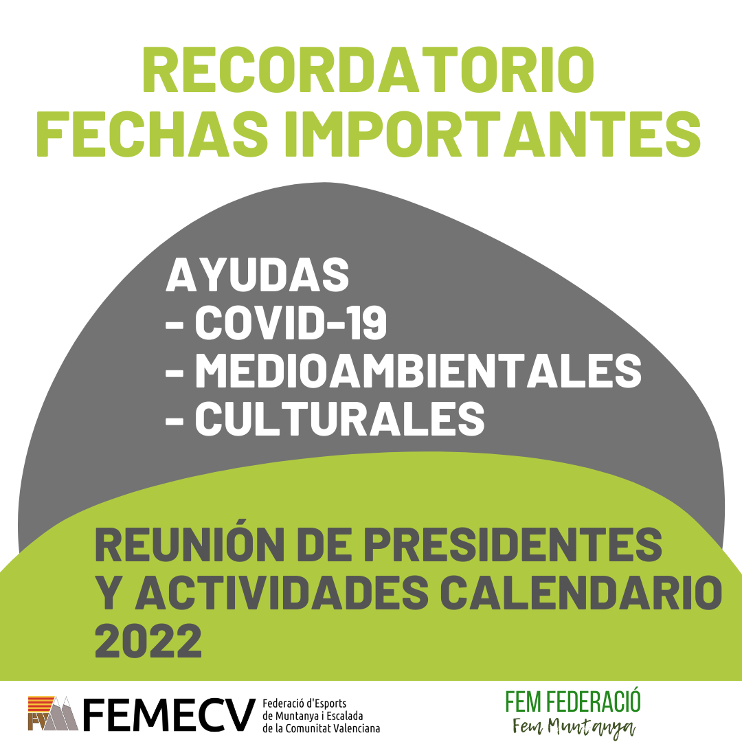 Por otra parte, el 4 de septiembre se celebrará la REUNIÓN DE PRESIDENTES Y SECCIONES DE MONTAÑA FEMECV, donde se tratarán temas relevantes y se configurará el calendario de actividades de 2022, para el que se necesita que los Clubs interesados en organizar alguna de las competiciones o actividades asociativas envíen la solicitud para su adjudicación antes del día 2 de septiembre, al correo direcciontecnica@femecv.com.