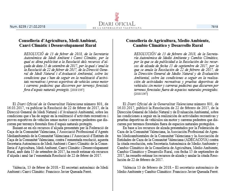 Por parte de la Federació d’Esports de Muntanya i Escalada de la Comunitat Valencina, no estábamos en conformidad con esta resolución y aplaudimos a la Conselleria de Agricultura, Medio Ambiente, Cambio Climático y Desarrollo Rural por la retirada de dicha resolución.