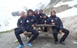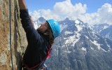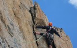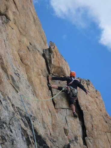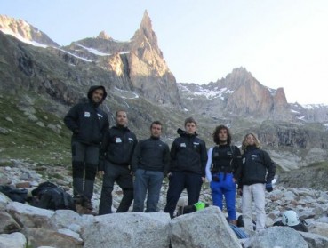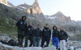 La siguiente idea según el plan era subir a la Meije, pero al quedar retrasado por el inesperado miércoles de lluvia, decidimos cambiarlo por subir a escalar a la Dibona, una imponente aguja de trescientos metros que domina el valle de Soreiller. Con alguna baja como la de Yannick con la mano hinchada por una caída en los bloques del glaciar de la Pilatte y Jesús con unas ampollas en los talones bastante importantes. Se repitieron las vías “Madier” y “Sep d’un Coup”.