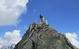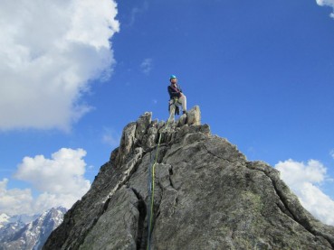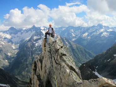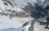 La vía de les Bans se encontraba en unas condiciones optimas y largo tras largo terminamos los trescientos y pico metros en un pequeño collado que daba acceso a la arista, que todo hay que decirlo, estaba completamente en ruinas. Coronamos la cumbre noroeste, desde donde vimos descender a nuestros compañeros por el glaciar ya de vuelta al refugio y continuamos la arista en busca de la línea de rapeles, que todo hay que decirlo, estaban completamente en ruinas.