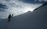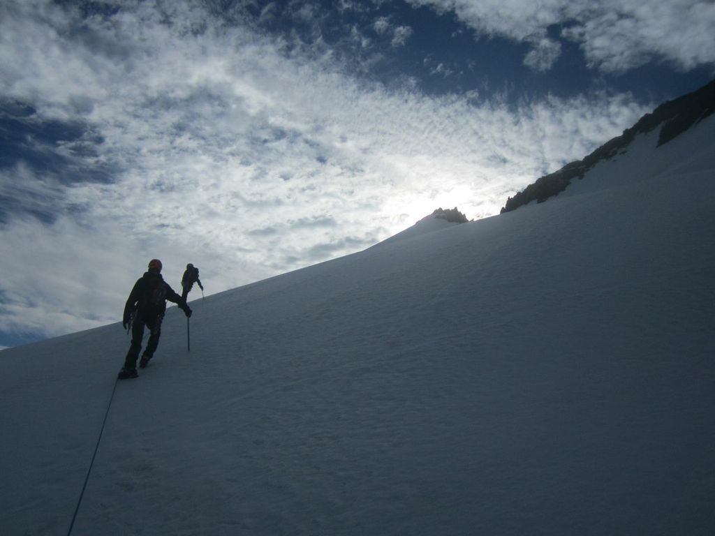 Aproximamos el miércoles entre chubasco y chubasco, ya que la meteo no se equivoco. La idea era dividir el grupo en dos, unos irían a las Puntas de la Pilatte, la cumbre que domina el glaciar de La Pilatte y los otros tres iríamos a la cara norte de les Bans, una ruta de hielo bastante llamativa y estética que separa las dos cumbres de esta bonita montaña. Al día siguiente, más bien a la madrugada siguiente, ya que tocaron diana a las dos de la mañana, salió un día raso y atravesamos el glaciar antes de aparecer las primeras luces, que nos encontraron buscando el paso de la rimaya. Para entonces estaban saliendo los del segundo grupo del refugio hacia el glaciar.