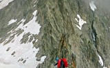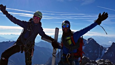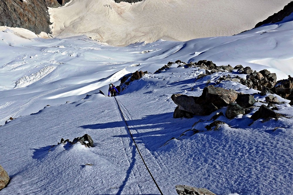 La otra cordada haríamos la arista Este o arista integral de la Barre, empezando la arista totalmente a la izquierda de la montaña y atravesando esta por toda la arista, el descenso es común con la otra ruta. Diedros mixtos de cuarto grado apretado, corredores encajonados y travesías con mucho, mucho ambiente. Una ruta bastante exigente para iniciarse en el mundo de los cuatro miles.