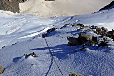 Saliendo de Pre Madame Carle, un poco más arriba de Ailefroide nos dirigimos al refugio del glaciar Blanc, refugio des Ecrins. Desde allí al día siguiente y divididos en dos cordadas atravesamos el glaciar en dirección a la Barre, la montaña mas alta de los Ecrins y la única junto con el Dome que superan los cuatromil metros.