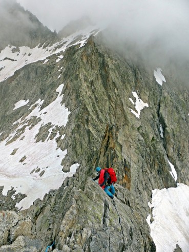 Una de las cordadas haría la ascensión clásica, que va hasta el hombro que separa la Barre con el Dome y escala directamente la arista hasta la cumbre, con retorno deshaciendo la arista en dirección contraria.