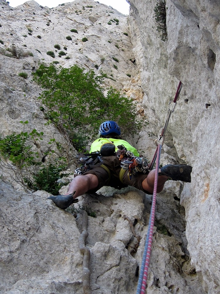 Las dos cordadas que quedamos después del sábado nos metemos en la vía Nigromancia, está empieza con un largo de chimenea a tramos bastante estrecha muy sugerente y sigue por un largo diedro a veces extrapolado que recorre toda la pared, para ir al loro con los grandes bloques que encontramos en el diedro. Termina con un tremendo largo de fisura este si totalmente extraplomada donde usaremos todos nuestros Friends.