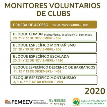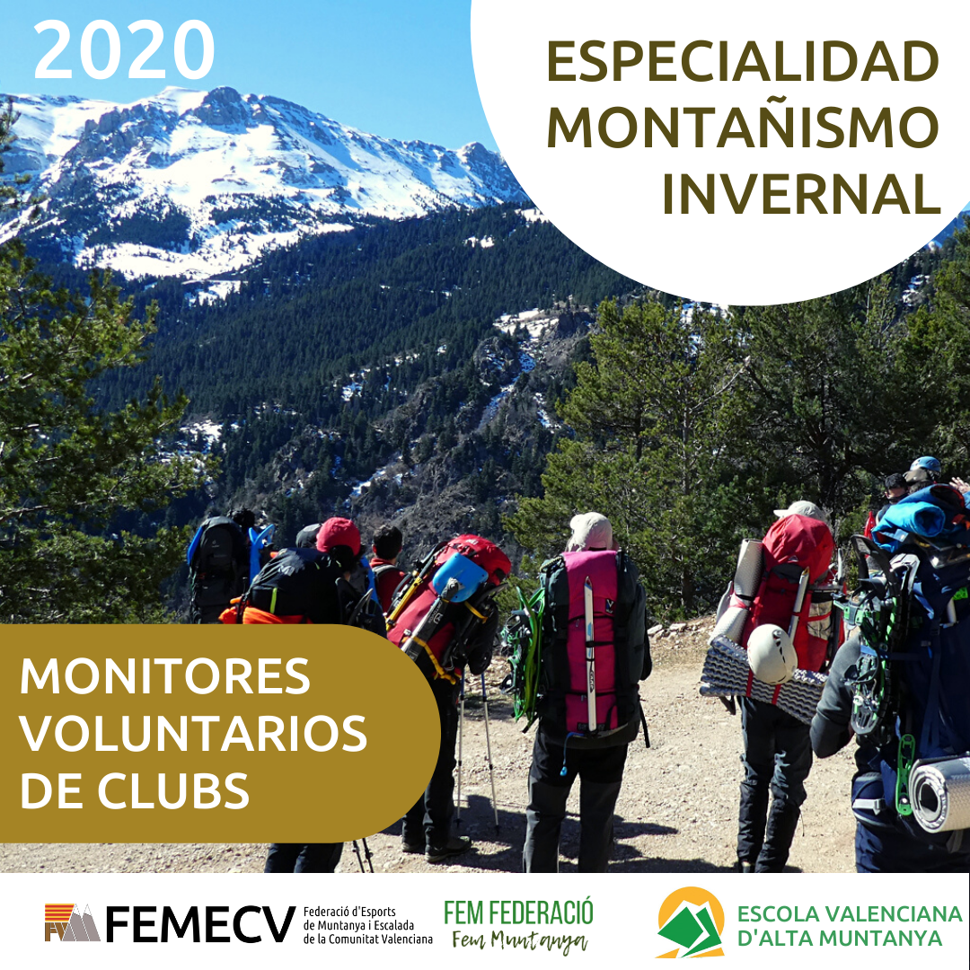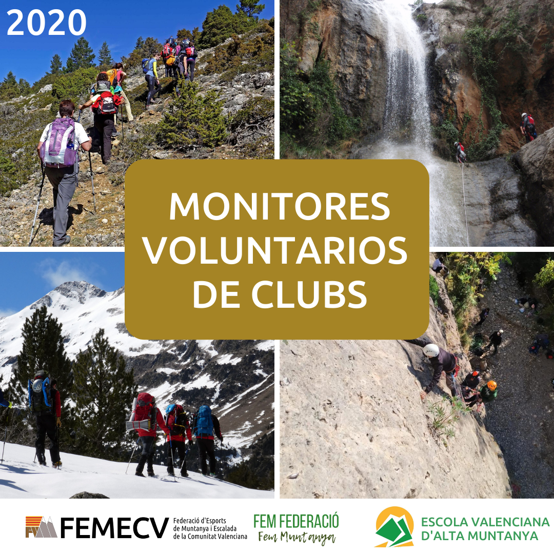 Los Cursos para Monitores/as Voluntarios/as o monitor/a benévolo/a, se dirige a las personas deportistas que dentro de los clubs quieren transmitir sus conocimientos en cualquiera de las especialidades de montaña. Esta titulación acredita al deportista para la organización de las actividades del club, siendo capaces de elegir las salidas en función de del grupo, la meteorología, el itinerario… y aportar seguridad en estas actividades en el medio de montaña.