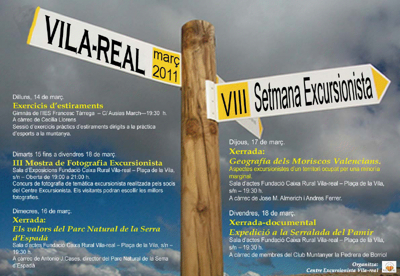 Les activitats estan organitzades pel Centre Excursionista Vila-real, i es celebraran a la Sala d'actes de la Fundació Caixa Rural de la població (plaça de la Vila) a partir de les 19:30 hores.