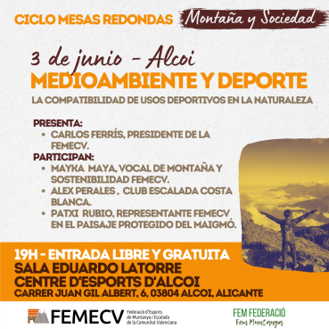 Se trata de una mesa sobre Ciclo de mesas redondas sobre “Medio Ambiente y Deportes de Montaña”, y tendrá lugar el próximo viernes 3 de junio en Alcoi.