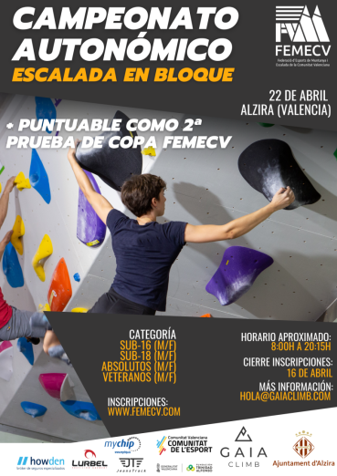 Seguimos con la temporada de escalada de competición 2023, anunciando el segundo de los 3 campeonatos autonómicos, en este caso el de bloque. Organizado por Gaia Climb, la prueba tendrá lugar el día 22 de abril de 2023.