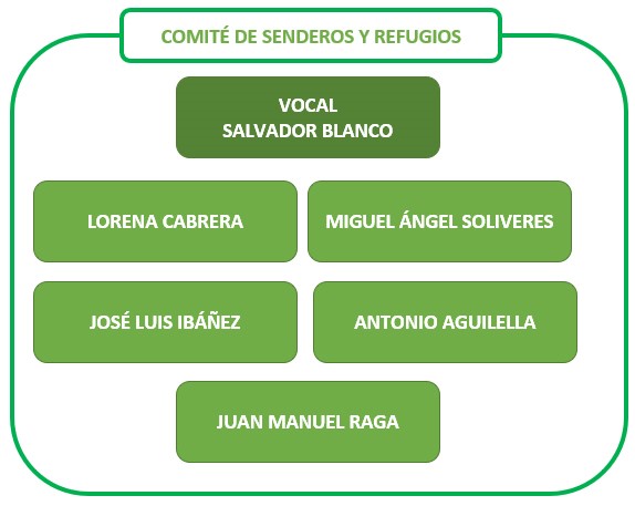 El Comité de Senderos y Refugios se encargará de lo que atañe a senderos y refugios en todos los aspectos que surjan y competan a la FEMECV y los que se soliciten desde la dirección de la misma. Está compuesto por un mínimo de 4 y un máximo de 12 miembros dirigidos por el vocal de Senderos y Refugios de la FEMECV. Actualmente tiene la siguiente composición: